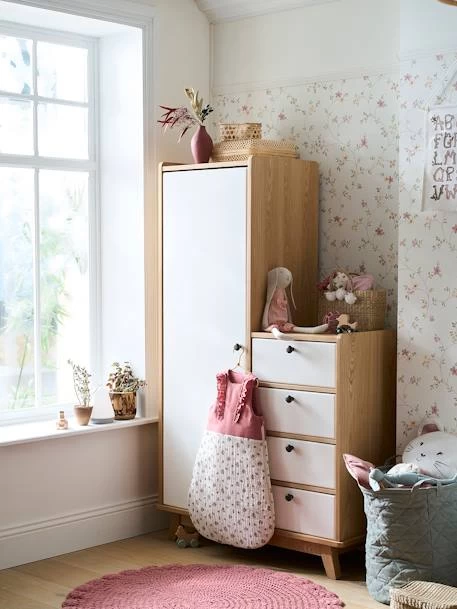 Aussi jolie que pratique, cette armoire au design rétro possède un côté commode et un côté penderie ! On tombe sous le charme du bois de chêne, de sa forme asymétrique et de ses poignées rondes en métal très déco.