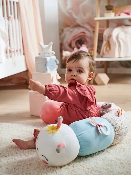 Un adorable jouet d’éveil en forme de chenille et composé de 6 coussins remplis de surprises ! Anneau de dentition, jouet vibrant, miroir, rubans… bébé sera émerveillé devant tant de chouettes activités !