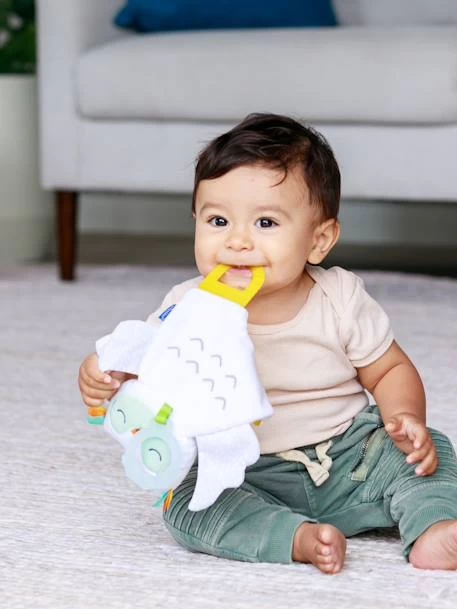 Ce joli coffret comprend un doudou chouette tout doux doté de petits pieds en plastique souple et d’un anneau en silicone à mordiller luminescent pour réconforter bébé la nuit et de deux hochets de dentition multitexturés. Le hochet fleur permet à bébé de soulager ses gencives en mordillant les pétales.