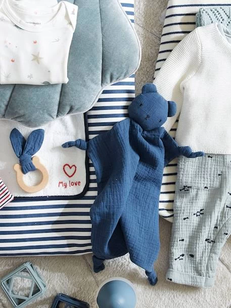 Livré dans un pochon en lange, ce joli doudou plat accompagné d’un hochet en bois avec oreilles en tissu fait un superbe cadeau de naissance ! En sa compagnie bébé se sentira rassuré et entouré de douceur…