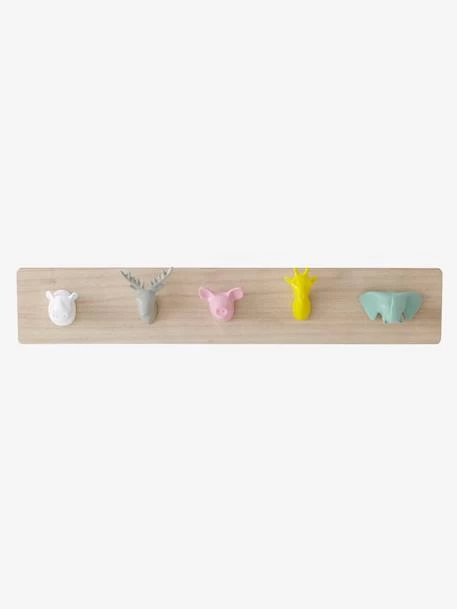 Porte-manteau enfant composé d’une plaque de bois et d’animaux en résine.