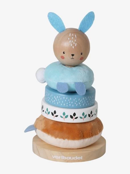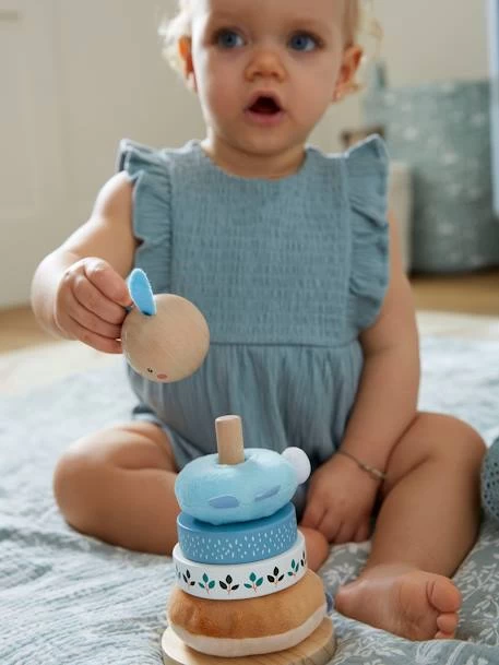 Une jolie tour à empiler composée d’éléments en bois et en tissu. Bébé pourra s’exercer à placer les différents anneaux sur la tige en bois. Une fois terminé, ce jouet posé sur une commode participera à une tendre déco de chambre.