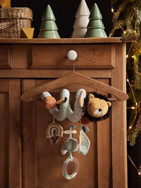 - Spirale avec 3 jouets : une feuille, une tortue hochet à billes, un arc-en-ciel avec rubans et grelot