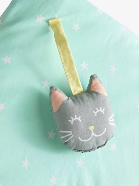 - Jouets attachés au tapis : 1 lapin avec oreilles en volume, 1 nuage « pouet-pouet », 1 livre avec 4 pages imprimées et papier crissant, et un chat avec clochette.