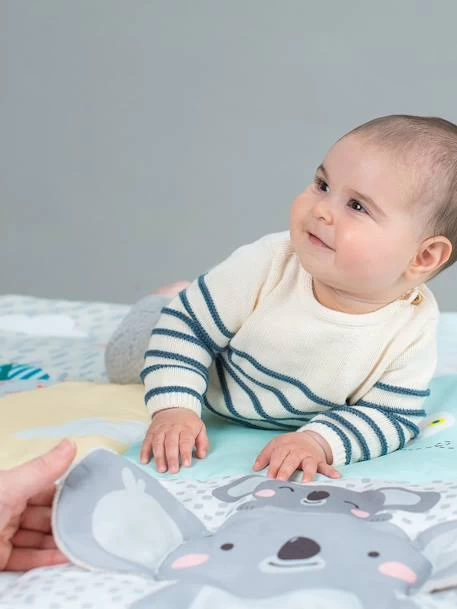 Un grand tapis d’éveil sans arche pour que bébé puisse jouer, s’allonger, s’asseoir et se retourner en toute sécurité ! De nombreuses activités: anneau de dentition, miroir détachable, anneaux en plastique et formes bruissantes.