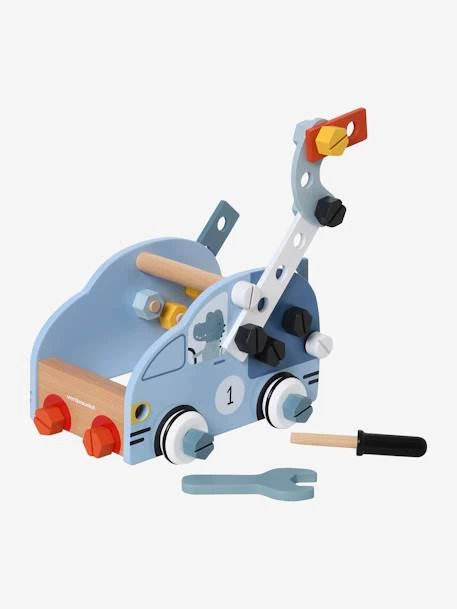 - Voiture équipée de 2 outils : 1 clé à molette et 1 tournevis et d’équipement de construction : 22 vis, 12 boulons, 4 roues, 6 règles à trous